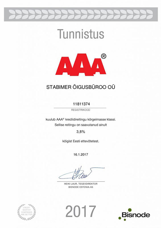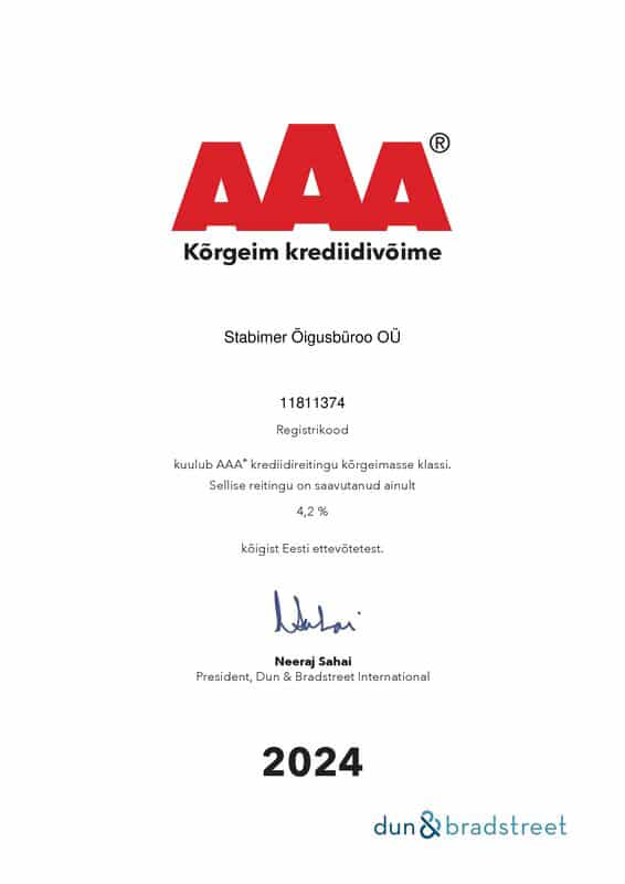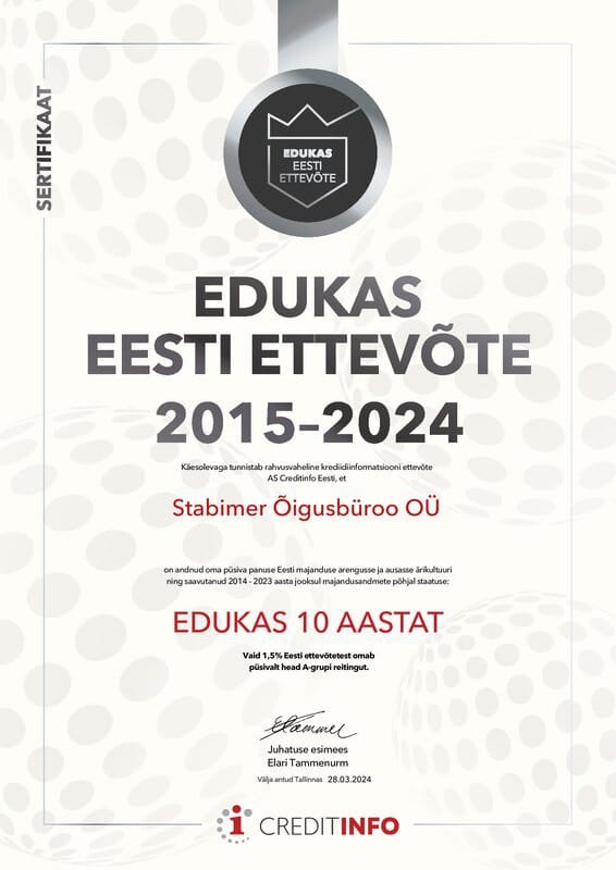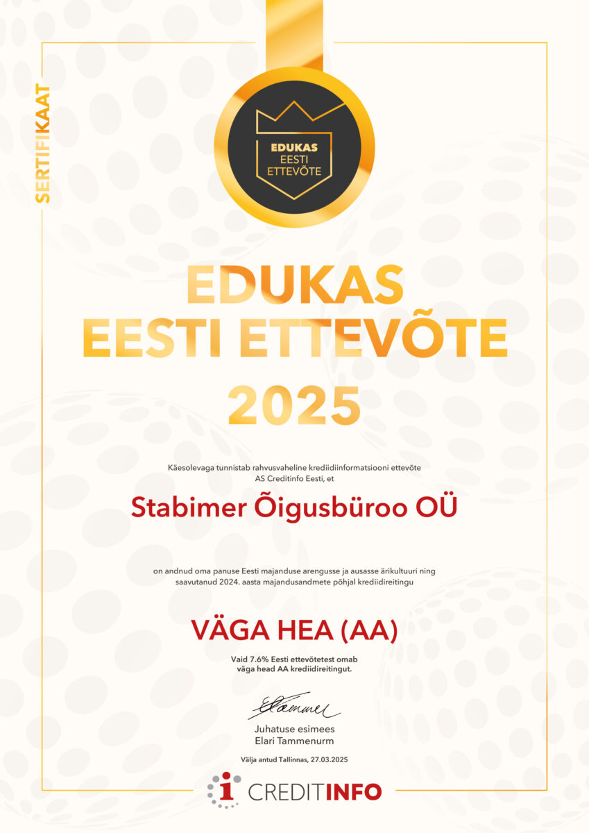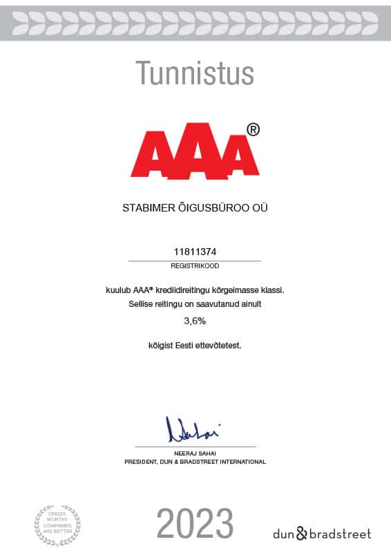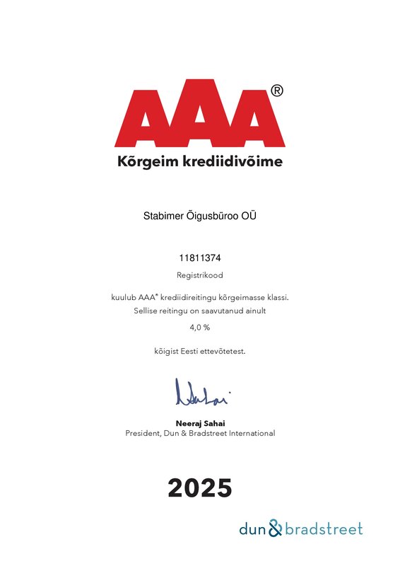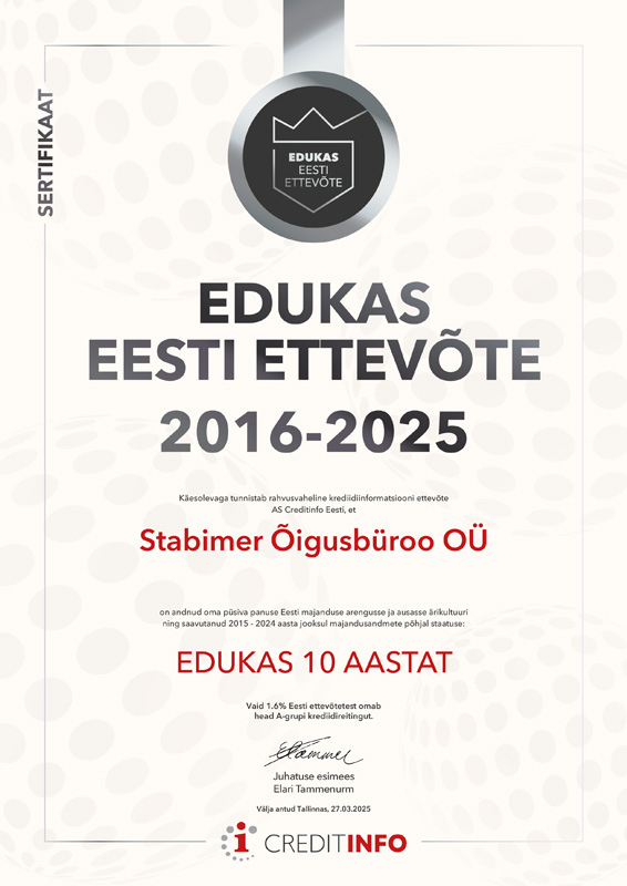 Stabimer Õigusbüroo OÜ pakub laia valikut professionaalseid juriidilisi teenuseid nii eraisikutele kui ka ettevõtetele. Meie juristid Tallinnas aitavad Teid erinevates õigusvaldkondades, alates tsiviil- ja perekonnaõigusest kuni keerukate töövaidluste ja võlgade sissenõudmiseni. Pakume õigusabi, mis põhineb personaalsetel lahendustel, kiirel reageerimisel ja põhjalikel teadmiste.