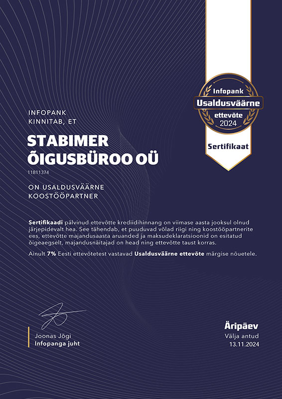 Oleme pühendunud sellele, et pakkuda usaldusväärset ja tulemusele orienteeritud õigusabi, mis aitab Teil lahendada ka kõige keerulisemad probleemid. Kui otsite kogenud juristi Tallinnas, kes leiab teie jaoks parima lahenduse, on Stabimer Õigusbüroo OÜ Teie usaldusväärne partner.